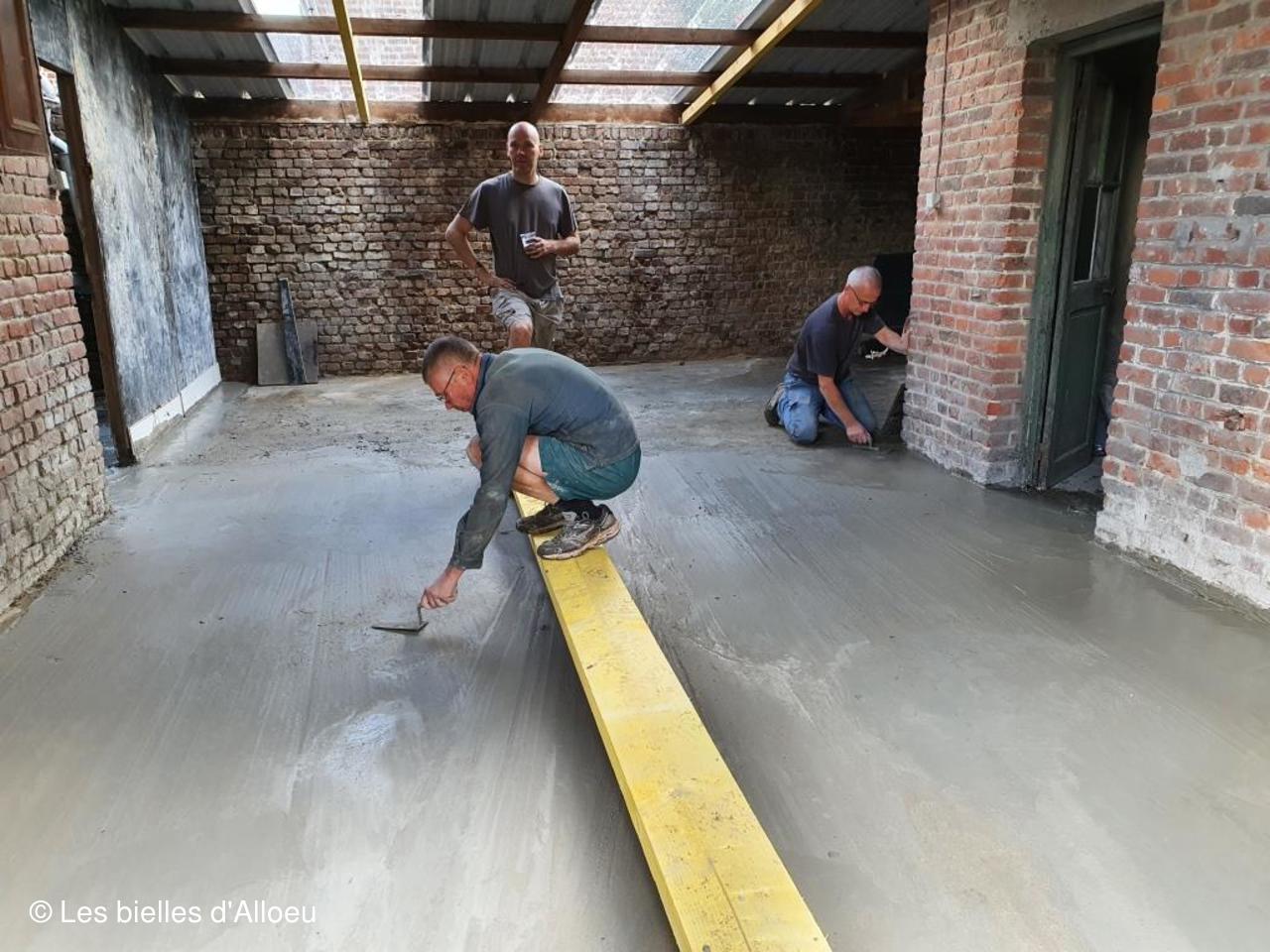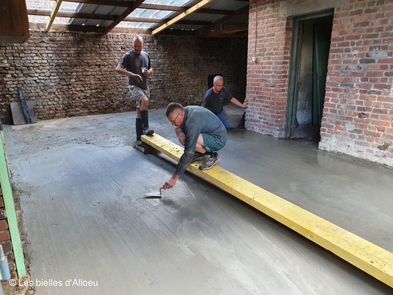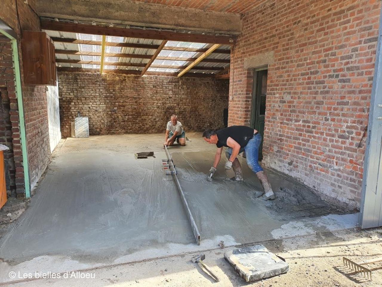 2 bétonnières et quelques brouettes, et la détermination des personnes présentes, ont permis de réaliser cette dalle dans un temps record.