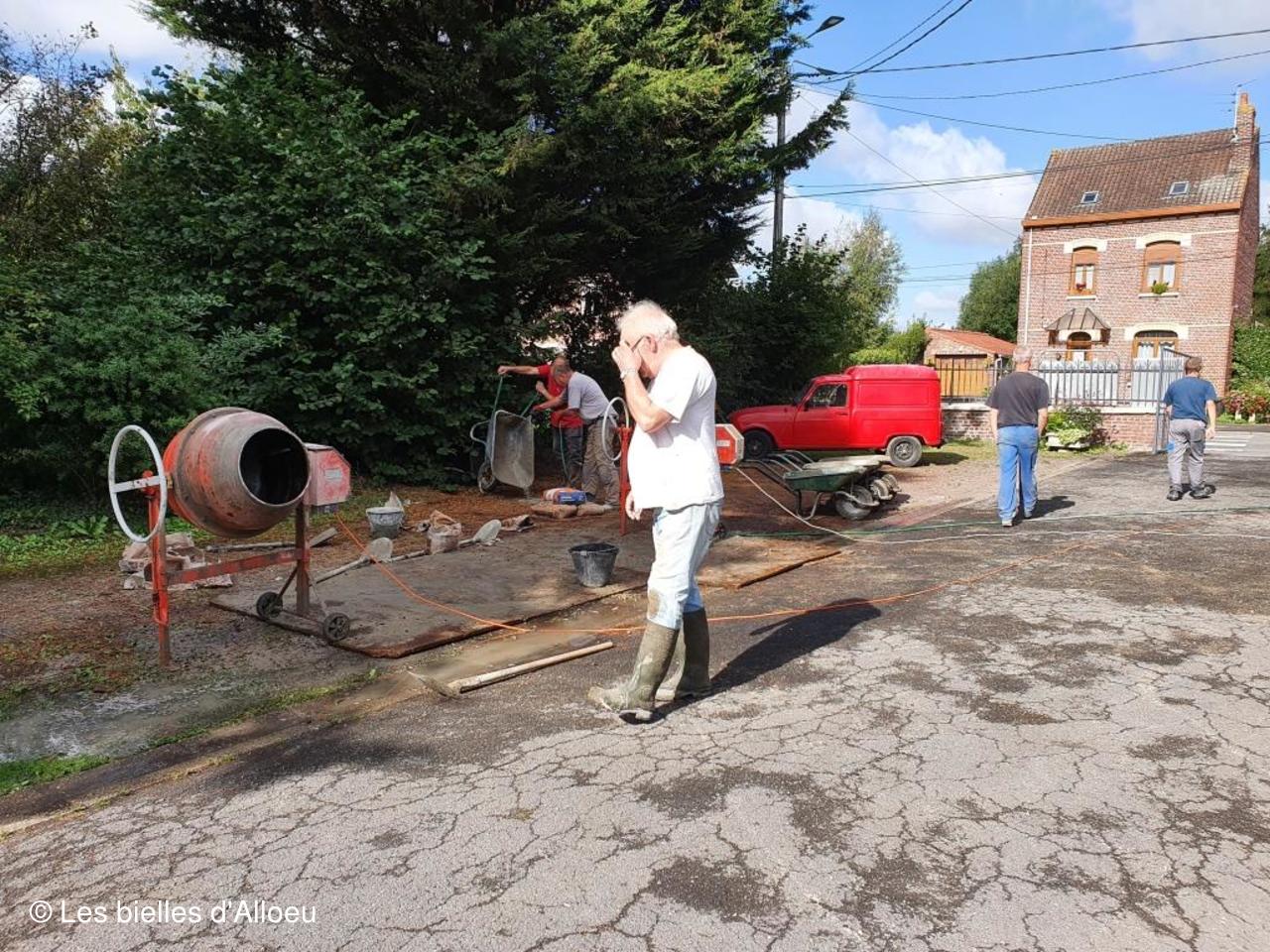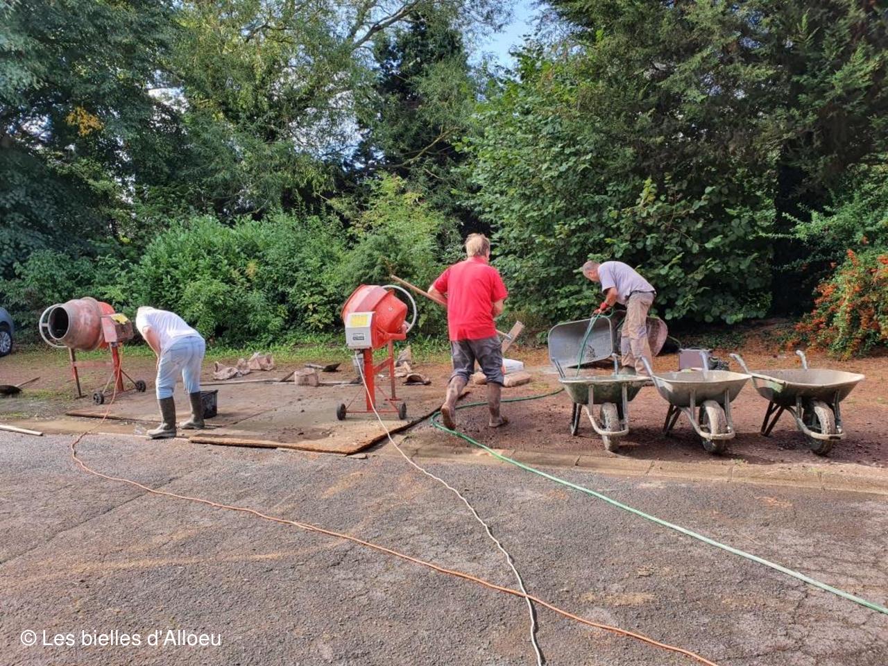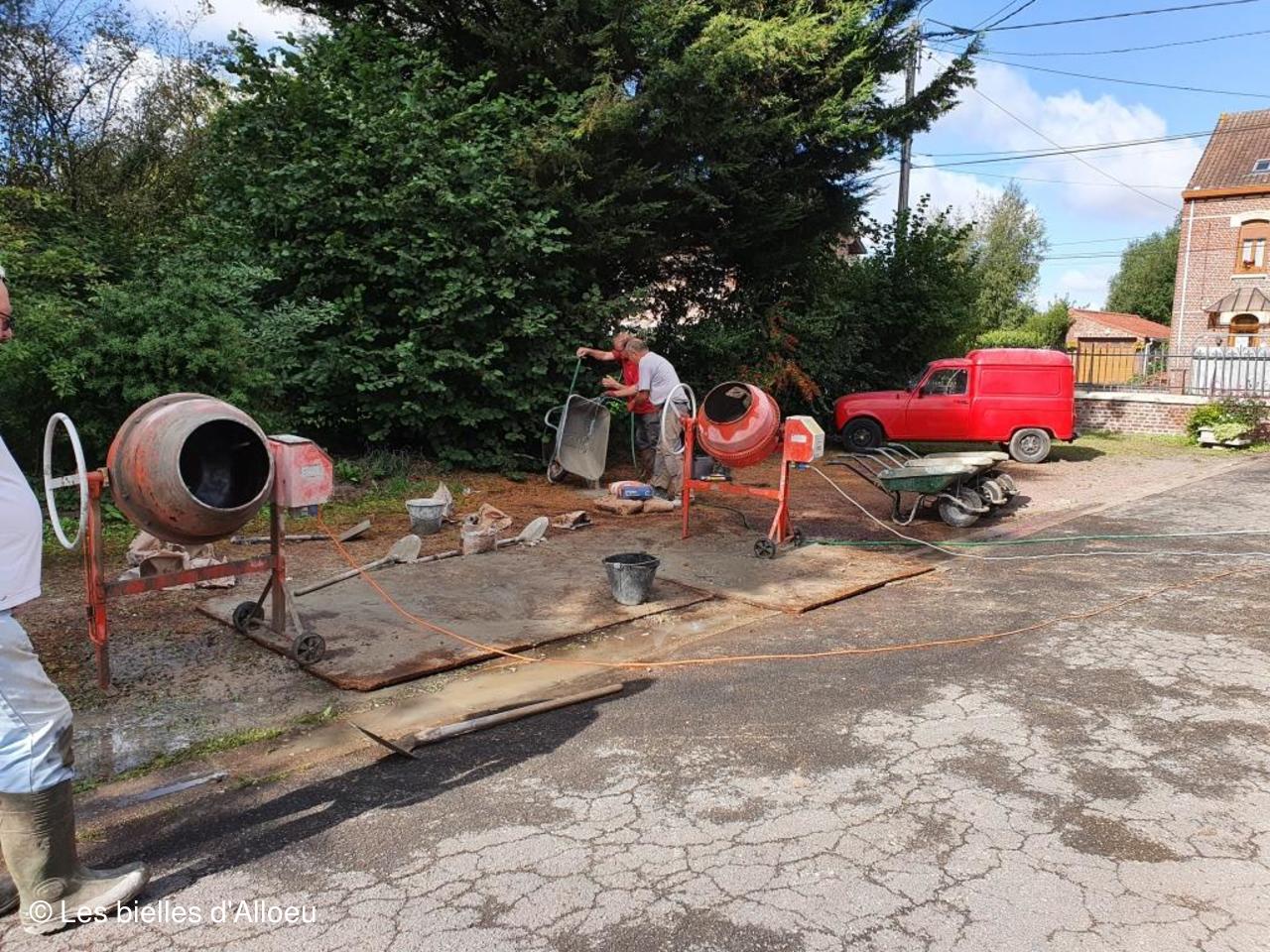 2 bétonnières et quelques brouettes, et la détermination des personnes présentes, ont permis de réaliser cette dalle dans un temps record.